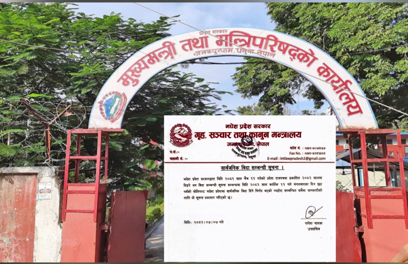 गृह, सञ्चार तथा कानुन मन्त्रालय, जनकपुरधामद्वारा शुक्रबार जारी सूचना अनुसार प्रदेश राजपत्रमा प्रकाशित बिदा सम्बन्धी सूचना अनुसार यो दिन मधेश प्रदेशमा सार्वजनिक बिदा रहनेछ। मन्त्रालयका अनुसार यसअघि प्रदेश राजपत्रमा प्रकाशित बिदा सम्बन्धी सूचनाको आधारमा कात्तिक ११ गतेका लागि बिदा दिन निर्णय गरिएको हो।