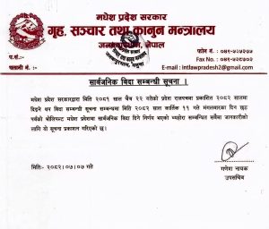 यस सम्बन्धमा सबै कार्यालय, निकाय तथा सरोकारवालालाई जानकारीका लागि सूचना जारी गरिएको मन्त्रालयका उपसचिव गणेश नायकले जानकारी दिएका छन्।