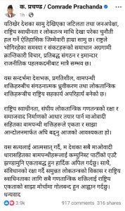 प्रचण्डले माओवादी धारसहितका सबै वामपन्थी शक्तिहरूलाई एउटै कम्युनिस्ट पार्टीको झण्डामुनि एकताबद्ध हुन अपिल गरेका छन्। उनले संविधानको रक्षा, समुन्नत लोकतन्त्रको विकास र राष्ट्रिय स्वाधीनताको सुदृढीकरणका लागि राष्ट्रिय एकताको साझा मोर्चा आवश्यक रहेको बताएका छन्।