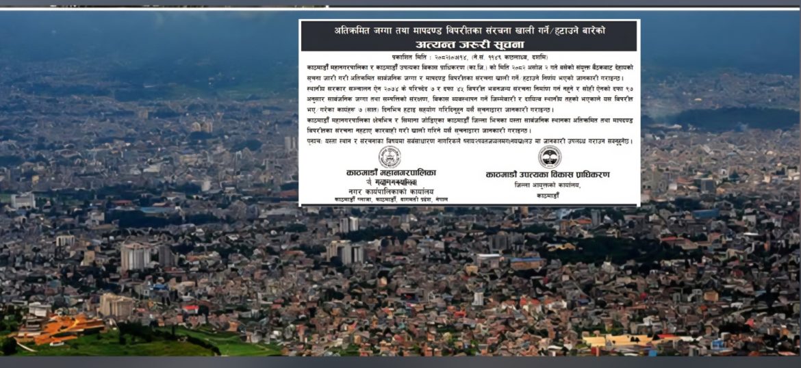 काठमाडौं, १४ कात्तिक – काठमाडौं महानगरपालिका र काठमाडौं उपत्यका विकास प्राधिकरणले महानगरभित्रका अतिक्रमित जग्गा र मापदण्ड विपरीत निर्माण भएका संरचना हटाउन सात दिनको अल्टिमेटम जारी गरेका छन्।