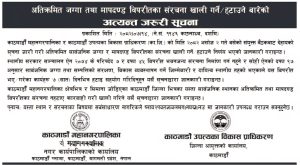 सूचनामा महानगरपालिका क्षेत्रभित्रका साथै सिमाना जोडिएका काठमाडौं जिल्लाभित्र रहेका सडक, नाली, सार्वजनिक पार्क, खुला स्थान तथा अन्य सरकारी जग्गामा बनाइएका अवैध संरचना, पर्खाल, पसल, टहरा लगायतका निर्माण स्वेच्छाले हटाउन भनिएको छ। तोकिएको समयभित्र नहटाए कानुनी प्रक्रिया अघि बढाई बल प्रयोग गरेर खाली गराइने चेतावनी समेत दिइएको छ।