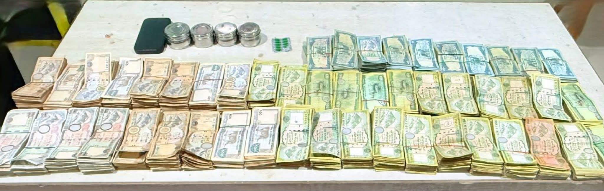 डेरा कोठामा खानतलासी गर्दा लागू औषध खैरो हेरोइन जस्तो देखिने पदार्थ ०.३७ ग्राम, ट्रामाडोल ९ क्याप्सुल, लागू औषध कारोबारमा प्रयोग हुने डिजिटल तराजु, नगद रु. १२,८१,००० (अक्षरेपी बाह्र लाख एकासी हजार), मोबाइल फोन (आईफोन) १ थान तथा अन्य सामग्री बरामद गरिएको जिल्ला प्रहरी परिसर काठमाडौंले जनाएको छ।
