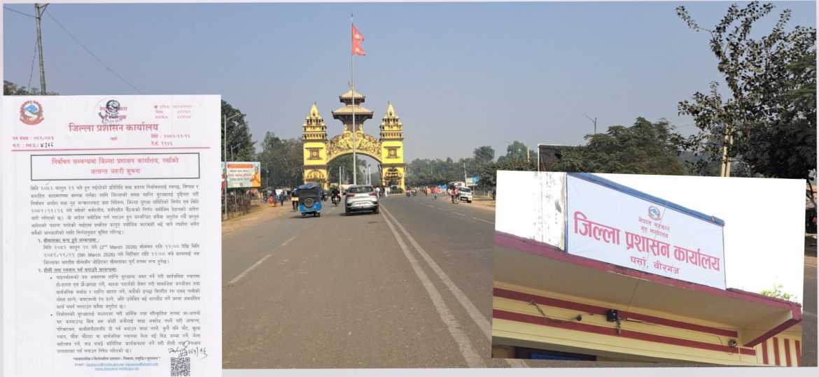 वीरगंज, १८ फागुन – प्रतिनिधि सभा निर्वाचनलाई मध्यनजर गर्दै जिल्ला प्रशासन कार्यालय पर्साले आज राति १२ बजेदेखि पर्सा जिल्लाका सबै सीमा नाकाहरू अस्थायी रूपमा बन्द गर्ने निर्णय गरेको छ।