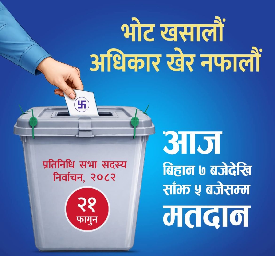 काठमाडौं, २१ फागुन —आज फागुन २१ गते देशमा प्रतिनिधिसभा निर्वाचन हुदैछ | जेनजी आन्दोलनपछिको विशेष परिस्थितिमा हुन लागेको प्रतिनिधिसभा सदस्य निर्वाचनअन्तर्गत आज देशभर मतदान हुँदैछ। देशभरका ७७ वटै जिल्लामा बिहान ७ बजेदेखि अपराह्न ५ बजेसम्म एकै चरणमा मतदान हुने भएको हो।