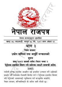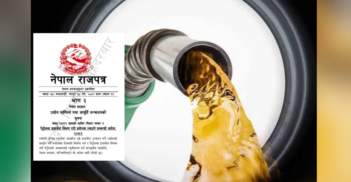 सरकारले पेट्रोलमा इथानोल मिश्रण गरी प्रयोग गर्ने नीति लागू गरेको छ। मन्त्रिपरिषद्ले जारी गरेको ‘पेट्रोलमा इथानोल मिश्रण गरी प्रयोगमा ल्याउनेसम्बन्धी आदेश, २०८२’ राजपत्रमा प्रकाशित भएसँगै नेपाल आयल निगमले उपलब्धताअनुसार पेट्रोलमा अधिकतम १० प्रतिशतसम्म इथानोल मिसाउन सक्ने व्यवस्था गरिएको छ।