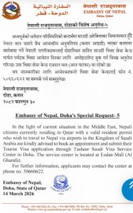 काठमाडौँ, ३० फागुन — कतारमा रहेका घर फर्किन चाहने नेपाली नागरिकलाई त्यहाँस्थित नेपाली दूतावासले सम्पर्कमा आउन आग्रह गरेको छ। मध्य पूर्वको वर्तमान परिस्थितिलाई ध्यानमा राख्दै दूतावासले यस्तो सूचना जारी गरेको हो।
