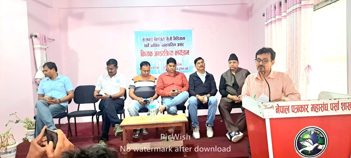 नेपाल प्रेस युनियन पर्सा शाखाले सोमबार वीरगञ्जमा आयोजना गरेको “सरकारी निर्णयले निजी मिडियामा पार्ने आर्थिक तथा व्यवसायिक असर” विषयक अन्तरक्रियामा नेपाल पत्रकार महासंघका सचिव अशोक तिवारी ले सरकारको निर्णयविरुद्ध चाँडै आन्दोलनका कार्यक्रम घोषणा गरिने जानकारी दिए।