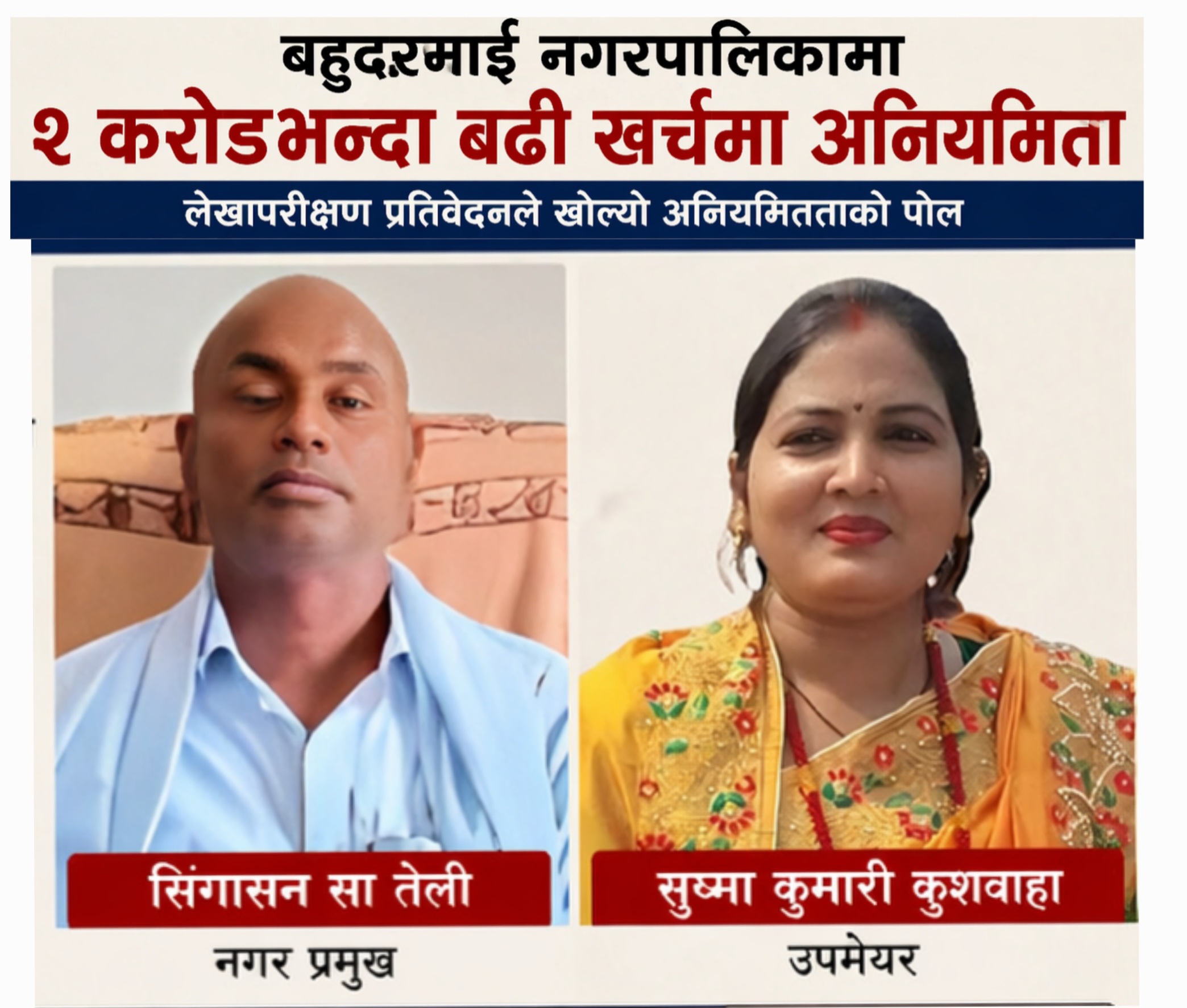 बहुदरमाई,पर्सा ११ बैशाख — बहुदरमाई नगरपालिका पर्सा मा आर्थिक वर्ष २०८०-८१ को दौरान विभिन्न ९ शीर्षकमा गरिएको २ करोडभन्दा बढी खर्चमा गम्भीर अनियमितता भएको खुलासा भएको छ। सार्वजनिक भएको लेखापरीक्षण प्रतिवेदनले खर्च प्रक्रियामा कानुनविपरीत कार्य भएको औंल्याउँदै पारदर्शिता र जवाफदेहितामाथि प्रश्न उठाएको छ।
