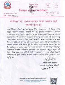यस्ता संरचनामा व्यवसाय सञ्चालन गर्दा घरधनी, व्यवसायी तथा सर्वसाधारणको ज्यानसमेत जोखिममा पर्न सक्ने भन्दै प्रशासनले तत्काल त्यस्तो कार्य रोक्न आग्रह गरेको छ।